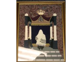 A most fabulous and unusual piece of art. It is a 24/30 inch, hand-quilted collage depicting a man praying at the Bima. The background in a vivid pattern includes bricks from the Western Wall in Israel. The Bima is in complete detail, including a gold crown and a silver eternal light. The colors are vivid with portions framed in gold threads. This masterpiece is framed in a plain gold frame so as not to detract from this wonderful piece. This should definitely be hanging in a place of honor in your home.