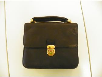 Like new faux leather bag has a front flap with gold-tone hardware and opens to two compartments. Zippered pocket on back. Cute!