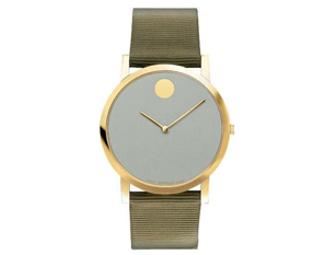 This watch features a polished gold plated stainless steel case, Khaki Green fabric on Genuine Leather Strap, handsome Grey Museum dial set with the Movado Signature Concave Dot, gold tone hand indicators, Scratch Resistant Sapphire Crystal protects the face, Swiss Quartz movement. Water resistant to 30 meters/100 feet.
