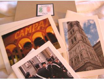 This boxed set of greeting cards by Patrick Casey contain several color photos of images captured in Italy. The box cantains six images mounted on white card stock with matching envelpes. The cards carry a hand colored logo on the back of each.