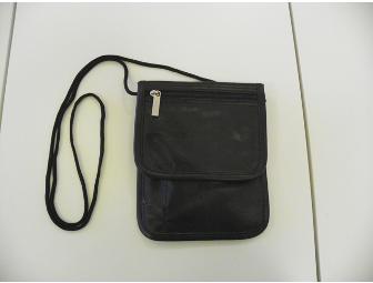 This little passport/travel purse by Brookstone can be worn around your neck or on your belt. Black leather with cording strap that can be knotted to shorten length. Flap closure opens to reveal a mesh zippered pocket, a compartment large enough for a passport and slip pockets for  a notebook and pen. The outside there are two additional zip pockets. A very handy item for the traveller. Looks like new.