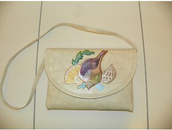 This purse was made for summer. Off white faux leather is embossed with a sea shell motif on front flap. Flap with velcro closure opens to a compartment with zippered pocket inside. Lined in white fabric. Like new.