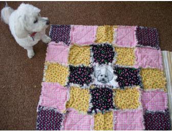 Darling quilt 32 X 32. Patch in the middle is of a Bichon. Main colors are black and pink. Cute patches through out. Can be washed and will get softer and softer with each wash.