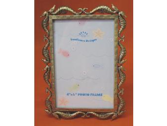 Rectangle picture frame encircled in seahorses. Frame is 4 x 6 inches and in the gold family of color.