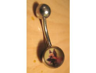 This navel ring is a standard barbell shape, featuring an adorable inlay of a german shepherd. Has never been worn - brand new. See other auction items for other dog breeds.