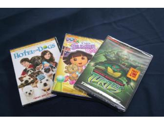 DVDs Turtles Forever, Slumber Party (Dora the Explorer), Hotel for Dogs, & Monsters vs Aliens.