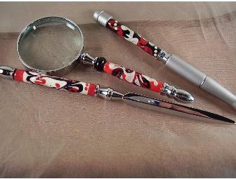 Classic beauty is evident in our unique executive gift set including a stylish pen, magnifying glass, and letter opener. Show your truly discriminating taste at the home or the office! Pens can be refilled with standard cartridges available at most office supply stores. The essence of Deb Rich's artistic expression is revealed in each lampwork bead that she creates in her studio. Deb's beads exhibit her desire to create and inspire change through community outreach. These jewelry pieces are offered exclusively through cMarket to support the fundraising efforts of non-profit organizations. Lampwork glass reflects both the heartfelt passion and interpretative expression of Deb Rich. Her artistic resume includes fantasy sculptures, creatively fashioned from found-objects and recycled materials. Deb's Glass Designs are truly hypnotic, one-of-a-kind pieces that cannot be replicated or manufactured by a machine. Deb only sells jewelry pieces that capture the grace and flow of glass artistry. All jewelry is made with sterling silver or copper findings, Czech or Swarovski Crystals, and various complementary beads, making Deb's Glass Designs positively the best choice.