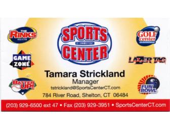 Enjoy mini golf for up to four people, one regular bucket of balls for the driving range, one fun bowl game token, four game zone tokens, one batting cage token, one lazer tag admission and one open skate admission to Sports Center of Connecticut in Shelton