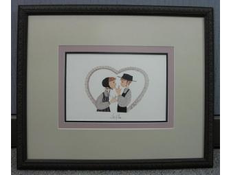 This sweet print called ''Lots of Love'' by artist P. Buckley Moss is number 329 of 1000 and signed by the artist. Print depicts an Amish boy and girl showing the sign language symbol for I love you. Matted and framed in soft lavender and grey in a dark brown frame. Framed print measures: 24 x 20 inches. P. Buckley Moss is one of America's most prized living artists. Having achieved success, she devotes a great deal of her time and effort to helping others. Donations of P. Buckley Moss art have raised over four million dollars for worthy charities. The P. Buckley Moss Foundation for Children's Education is devoted to promoting the use of art in the classroom, especially as a means to teach children with learning differences.