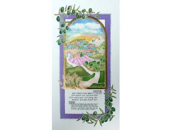 A most gorgeous 10 1/4" X 18 1/4", framed painting of a view of the road to Jerusalem. It is gold embossed and embellished by olive brances. It embellishes a beautiful prayer in Hebrew and English."May your desire be for Torah and Mitzvot. May your eyes look straight forward. May your mouth speak wisdom. May your heart meditate in reverence. May your hands be engaged in good deeds and may your feet run to do the will of your Father in heaven." This is Art from The Heart of Jerusalem. The artist is Rebecca Shore who lives in the old city of Jerusalem. This masterpiece will certainly enhance your home. It is a real bargain at $95