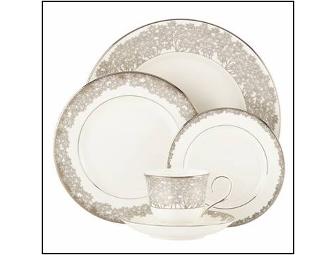 This distinguished place setting bears a lush design of daisies with burnished accents. Each piece is crafted of Lenox fine white bone china and accented with precious platinum. This package features four five-piece place settings, which include a dinner plate, a salad plate, a butter plate, a cup, and a saucer. Also included are four matching accent plates. Dishwasher safe.