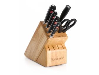 Classic Ikon knives feature a distinctive, double bolster design for professional-style heft, exceptional balance, and beauty. This set includes a 3.5-inch paring knife, a 6-inch utility knife, an 8-inch bread knife, an 8-inch cook’s knife, a 9-inch sharpening steel, stainless steel kitchen shears, and a 13-slot walnut storage block.