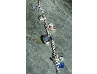 Created especially by CharmFactory.com for our Canyon School auction, this sterling silver charm bracelet features a Mom heart locket, a Mom taxi charm, a double-sided heart picture frame charm, a heart charm and an "l love taking flight" saphire crystal charm. A thoughtful gift for any Mom!