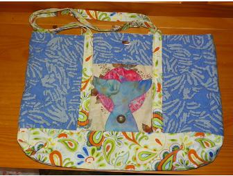 This roomy tote is so beautiful it makes you smile just to look at it. Brand new from the Mermaid Girl, this tote is made from quilted cotton and canvas. The front features a whale's tail on the pocket and is embellished with two stone buttons and a silver "hope' charm.