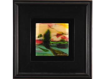 Fused glass wall art panel, framed and ready for hanging. This landscape is depicted in fused glass, framed, ready for hanging. The panel is kiln-formed and fired three times, using sheet glass of varying colors, with dichromatic glass ands 24kt gold accents. Signed on lower front.