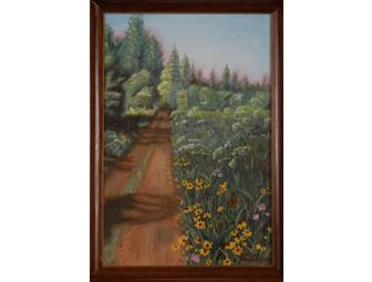 This 15" X 22" oil on canvas is a happy peaceful place, the artist would enjoy. The shadowy, country road with wild flowers seems to go on and on. Sunshine bounces off the natural flora, waving in the breeze, while a betterfly flutters by. Bright, cheery and stress free, it invites you in for a leisurelt stroll. The frame is in brown wood with a gold inner edge.