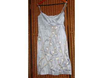 Blue dress made of dupioni silk. Couched with satin cords and silver leaves. Sleeveless with straps.