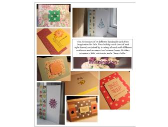 10 handmade cards from Imagination for Sale. Two of each holiday card shown, plus six others of varying sentiments: "just because", pregnancy, "happy hello", birthday, thank you and sentiments from children. Each card measures 5.5 x 4" and comes with a blank white envelope. The inside of each card is also blank, ready for your special message.
