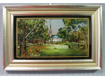 This beautiful reverse painting on glass, features a scene from a village church courtyard. The framed pictures measures 14 1/2 x 9 3/4 inches.