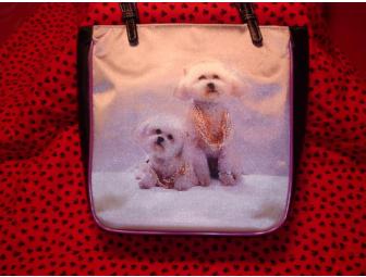 The purse has pictures of two adorable Bichons, Mom & pup on the front & back. The front picture is adorned with "bling" (rhinestones) on the pearl & gold necklaces they are wearing. Pictures are on lavender/white background with purple piping. The rest of the purse & straps are a soft "leatherlike" material. The straps have small buckles for length adjustments. It measures 10" high, 12" across the top, 9" across the bottom & 3 1/2" wide. It has 2- 26" straps/handles. Inside has 2 pockets for cell phone etc. & 1 zipped pocket.