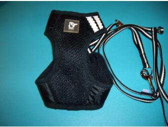 Harness is easy to put on and adjust for dog's body type. Loosen the squeeze clamp slider and hold the straps up. Put dog's head through. Then bring paws through, adjust and tighten the slider. Attach matching 3 foot leash that is included. Leash length about 4 foot, including the harness straps above the slider.