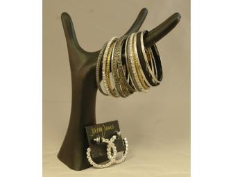 Variety of bangle bracelets (15 total) and crystal hoop earrings