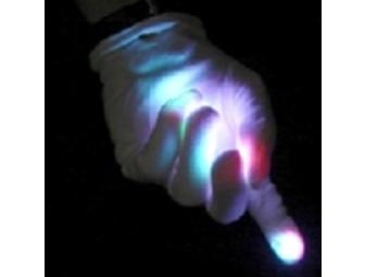 A magical effect is right at your fingertips with these awesome Mystical Mitts. Make crazy streaking patterns with your hands in the dark! Each finger and thumb has a built-in array of 3 LEDs at the fingertips in red, green, and blue, for a total of 15 LEDs per glove (30 per pair)! Six different lighting modes are selectable at the push of a hidden button: fast multicolor strobe, slow color morphing, steady on with all 3 colors at once, flashing all red, flashing all green, and flashing all blue.