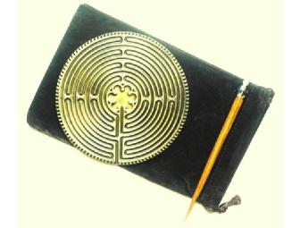 (like pewter, but with antiqued gold finish.) This replica of the 11-circuit Chartres Cathedral Labyrinth can be carried along on a morning walk or conveniently displayed in your home or office! . Includes wood stick for 'walking' the grooved path and a cloth storage bag.