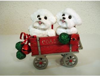 Two cute Bichons in their Christmas wagon. Can also be used as an ornament