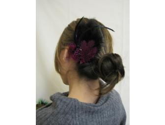 The perfect accessory! Subtle black beaded accents surrounded by a spray of pink and black feathers. 5” long by 3” wide. Backed with black felt and a metal hair clip.