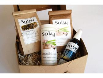 Soothe away stresses with our perfectly pampering, all-natural blends of bath soaks, powders, teas and sprays. Highly therapeutic and synergistic, our powders and soaks calm tired nerves while nurturing stressed skin to leave you feeling rejuvenated and relaxed. Our Solay natural stress relief gift set includes a 6 oz Solay essentials Stress Relief bath and foot soak (up to 18 baths) with Pure Himalayan crystal salt, prized for its rich mineral content, unites with immune-boosting antioxidant South African Rooibos “Red Bush” tea, calming chamomile and essential oils for inner peace. 2.6 oz Stress relief body powder which can be used as a self massage treatment, apply to skin morning, evening and anytime you feel stressed by gently rubbing into hands and massaging into skin. Also great as a foot powder, our 4 oz Breathe body scents aroma therapy blend of high quality essential oils of lavender, Lemongrass and Clary sage rejuvenating your mind and body and our 2 oz Stress relief Organic tea with organic Chamomile, organic Peppermint, organic Indian Green Tea (decaffeinated), organic Skullcap herb, organic Wood Betony, organic Catnip herb and organic Stevia herb + a wood scoop, all packaged in a recyclable box with eco friendly shredding. The perfect gift set for family friends or soothe away your own stress naturally.
