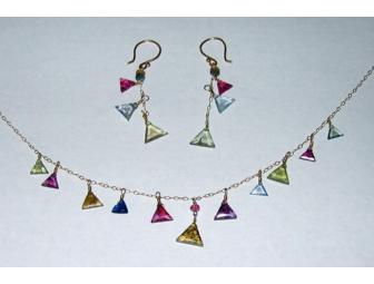 This delicate 14 karat gold necklace and earring set features hand-wrapped faceted triangular sapphires (5-8mm) in a variety of colors.