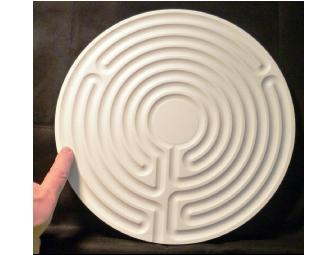 The design by artist John Ridder is a variation on the ancient classic 7 labyrinth.  It is similar to the Classic 7 but adds two turns, making the design is reminiscent of the more complex Chartres or medieval style labyrinths. It has been called a 'happy' labyrinth...    It is 12 inches wide, and made of a white stone-like material, typically used on counter tops. (Corian ) It is a 'green product'  as the base material is reuse of manufacturing waste.