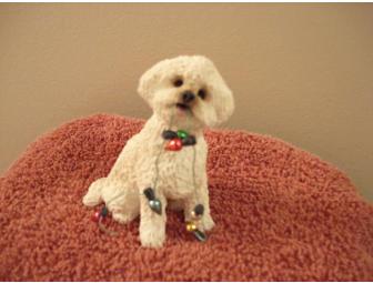 This cute we pup is eager to help with Christmas decorating. He/she is holding a little string of lights in its mouth. There is a gold cord for hanging on your tree. The ornament is made of sturdy resin material, standing about 3.5 inches. It is a brand new item. Removed only for photos.