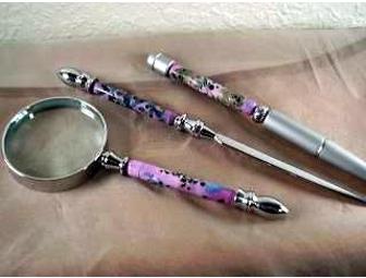 Peaceful flow is unmistakable in our unique executive gift set including a stylish pen, magnifying glass, and letter opener. Show your truly discriminating taste at home or at the office! Pens can be refilled with standard cartridges available at most office supply stores. Pens can be refilled with standard cartridges available at most office supply stores. The essence of Deb Rich's artistic expression is revealed in each lampwork bead that she creates in her studio. Deb's beads exhibit her desire to create and inspire change through community outreach. These jewelry pieces are offered exclusively through cMarket to support the fundraising efforts of non-profit organizations. Lampwork glass reflects both the heartfelt passion and interpretative expression of Deb Rich. Her artistic resume includes fantasy sculptures, creatively fashioned from found-objects and recycled materials. Deb's Glass Designs are truly hypnotic, one-of-a-kind pieces that cannot be replicated or manufactured by a machine. Deb only sells jewelry pieces that capture the grace and flow of glass artistry. All jewelry is made with sterling silver or copper findings, Czech or Swarovski Crystals, and various complementary beads, making Deb's Glass Designs positively the best choice.