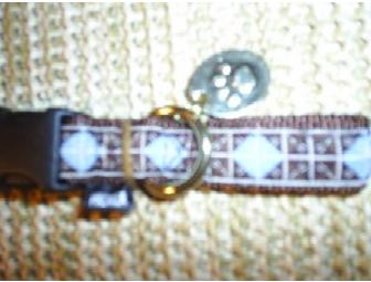 Chocolate Brown background web collar with slate blue and cream ribbon decoration. Also attached is a gold colored paw print charm.
