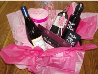 Includes a Lolita Pink Ribbon wine glass, a bottle of Cupcake wine, a cork screw, a pink lady wine bottle charm, "Fight Like a Girl" water bottle and cozy.