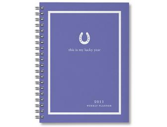A purple personal planner with a horseshoe on the front and "this is my lucky year"
