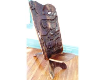 Beautiful, rare hand carved birthing chair from Africa with detailed images of African wildlife. Birthing chairs were designed to help midwives during delivery and were often used for other medical purposes. Birthing chairs help to control labor pain and allow expecting mothers to sit comfortably or recline. It is said to be from Madagascar.