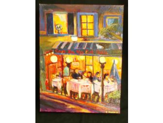 This beautiful 9"x12" acrylic painting by Elana Kuperstein Rosen of Cincinnati is a lively scene of a European café at night. The warm, inviting colors contrast with cool blue tones and evoke a slice of life in Paris. Ms. Rosen is a former graphic designer and substitute art teacher. She is available for art instruction and commissions.