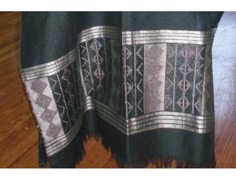 Beautiful, traditional handmade shawl from Senegal. It is black with silver, geometric patterns on the ends. Historically these shawls were designed for ceremonial purposes.