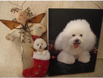Here are two special ornaments for your tree. The cute little Bichon is sitting in a soft red felt-like stocking. The stocking has silver beads and embroidey. It measures about 4 inches from top to bottom and has a ribbon hanger for the tree.Item is new - removed only for photos)