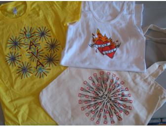 A vintage LAVA flaming heart tank top, a LAVA Tshirt, a tote bag, and 3 LAVA studio stickers! (All t-shirt and tank sizes available, to be arranged with winner.)