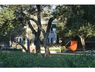 At the end of a quiet country lane in Kenwood, Kantara opens to an unexpected valley vista presided over by a spacious home with four bedrooms/four bathrooms and a gracious brick portico. Embraced by hillsides of young grapevines, olive trees and paths full of fragrant flowers, this home exudes comfort. A pool/jacuzzi stretches along the hill with an outdoor dining and entertainment deck, a full kitchen, and an authentic brick pizza oven. An added bonus is the separate guest house with two bedrooms, a bathroom, a small kitchen, and a large movie screening room. Children will love the outdoor play space and its wooden tree house and netted trampoline. Your wonderful wine country weekend escape in this beautiful 20 acre forest-bound secluded setting will be a retreat for the family. Sleeps 12 people.