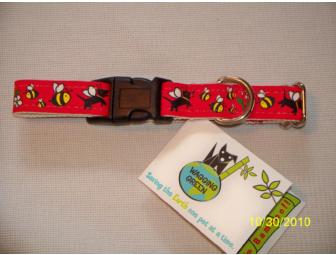 If your Bichon wants to "go green", this collar may be just the thing! It's made of 70% bamboo and 30% organic cotton, and it's Made in the USA! This is size Small, 3/4"W and 10-15"L. Not to mention, it's awfully cute and features honey bees and a happy dog, on a red background. Machine wash, cold.