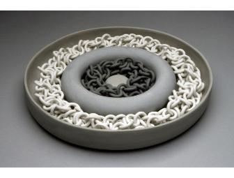 porcelain and stoneware; rings and rings of rings to handle and rearrange. Display components interacting in many ways. Comes with a stoneware "tray";