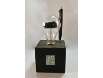 Comes equipped with the 5-pole Mini-Club motor. Floating center axle. Locomotive built into a light bulb. The light bulb stands on a stone base. An exclusive writing implement is included. The model of the class 89 tank locomotive has stood for 30 years as the synonym for Mini-Club. It was there right from the introduction of Mini-Club in 1972. The model of the class 89 in the light bulb symbolizes Mini-Club like no other image and it reflects the tiny aspects of the models. With a length over the buffers of 45 mm or 1-3/4" it has remained right up to today the smallest Mini-Club locomotive. On the occasion of the 30th birthday of Mini-Club Märklin is translating this symbolic representation into a limited edition in reality. The locomotive in the light bulb is quite suitable as a eye-catching decorative piece on any desk. A shaped base of precious stone forms the foundation. The light bulb together with the class 89 tank locomotive placed inside it is mounted on the base. In addition, a high quality ballpoint pen as an exclusive writing implement is included. How the locomotive got through the narrow neck of the light bulb will remain our secret.
