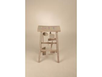 Julia loves words and feels that they contain such energy, such potential for real meaning. To also make them physically beautiful by rendering them in calligraphy is Julia’s passion! She scoured the Thesaurus for the 112 different verbs she had lettered on the stool, and hopes they will serve as inspiration and motivation for many days and years ahead. With the slightest breeze the dangling words will move, imparting even more energy in the piece. Julia has a BA in Design and is a member of the Society of Decorative Painters and a board member of the Calligraphy Guild of Indiana. Julia loves calligraphy and for the last eight years has been painting it right on her client’s walls. She also enjoys creating commissioned works on paper!