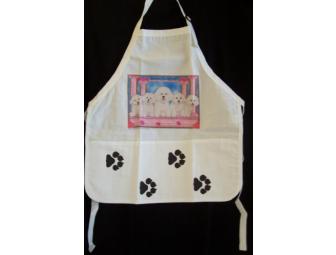 Present your best front with this screen print cotton canvas apron. Has 3 handy pockets and is adjustable to fit most of us. Cute family with paws prints.