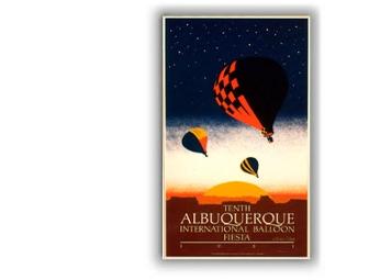 Third in the series by Philip Collier. This tenth anniversary poster returns to the earth-tone palette of the original 1979 edition. It was the first poster to explore the dawn launches that typify the Fiesta. Unlike the gradation effects of the 1980 image which were produced using spray techniques, Collier produced his background fades by rubbing pencils against coarse drawing paper. Published as a limited-edition serigraph in an artist-signed edition of 500 numbered prints plus an unsigned edition of 5,000 numbered prints. 17" x 29". Signed and numbered 2259/5000.